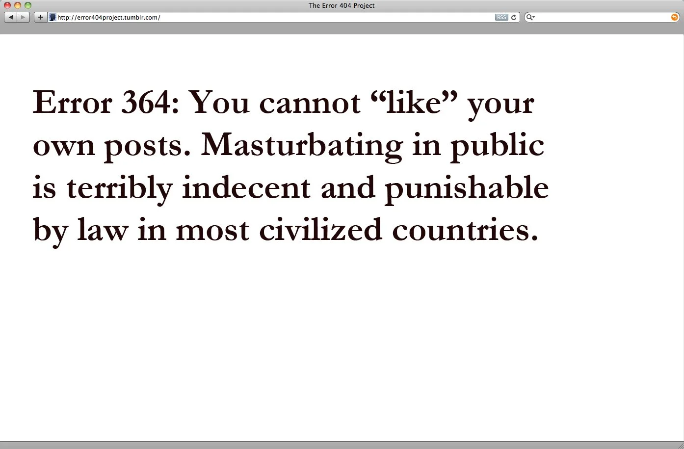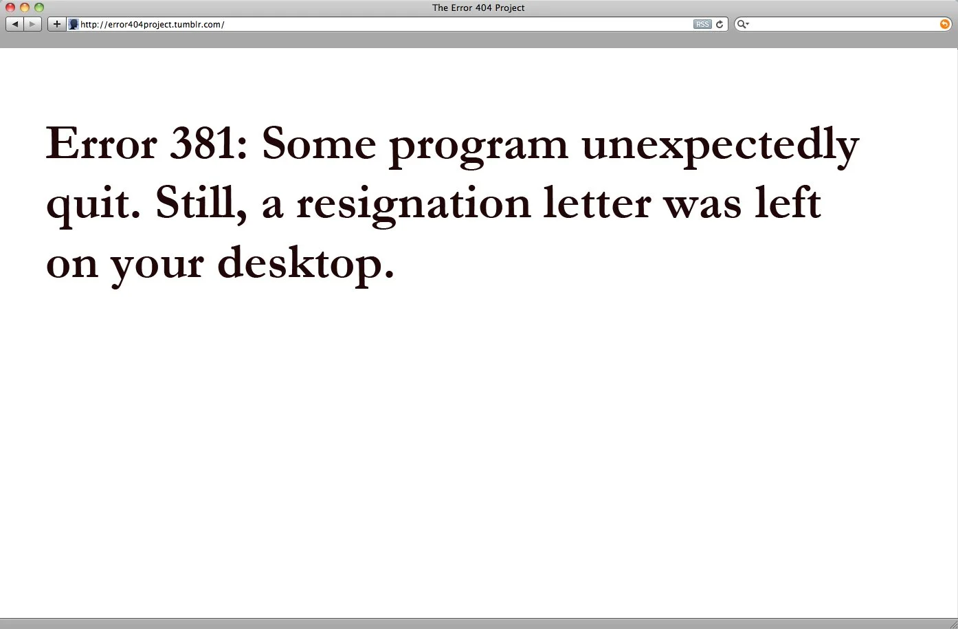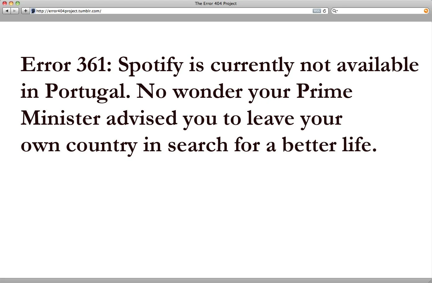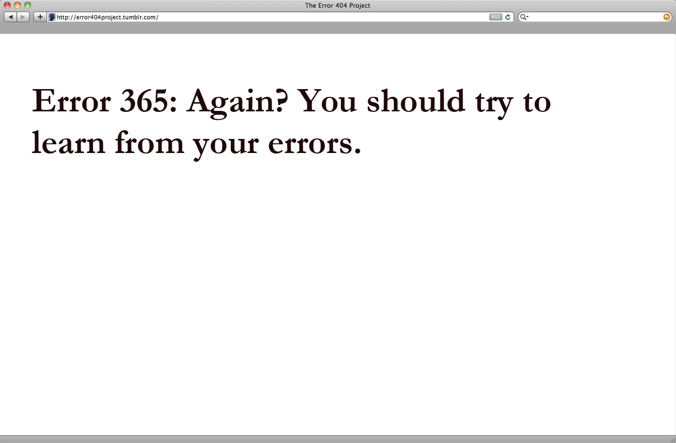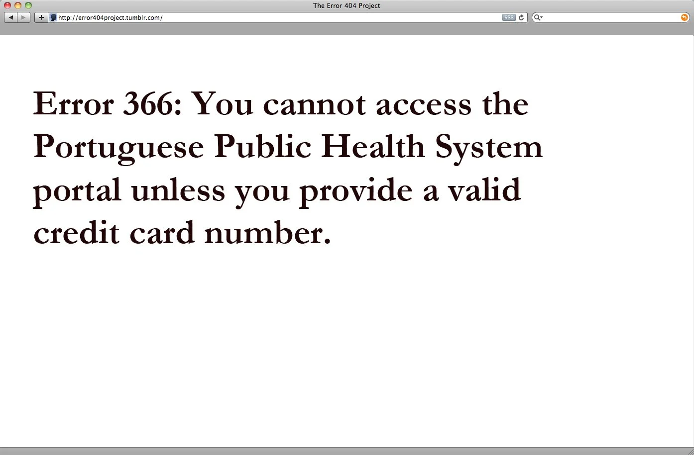 [PT] Tempos houve em que o "Erro 404", de "Página Não Encontrada", era um dos resultados mais populares da Internet. Todos os dias nos cruzávamos com ele, mas nunca reflectimos o suficiente sobre o assunto. Foi por essa razão que criei o "Error 404 Project", um site entretanto eliminado por falta de paciência do servidor: para responder à pergunta "Quais são os outros 403 erros?". Não tendo encontrado respostas que me satisfizessem o desejo de galhofa, inventei-os. Até ao Erro 360, que entretanto meteu-se o almoço, o Natal e a festa da escola dos miúdos.