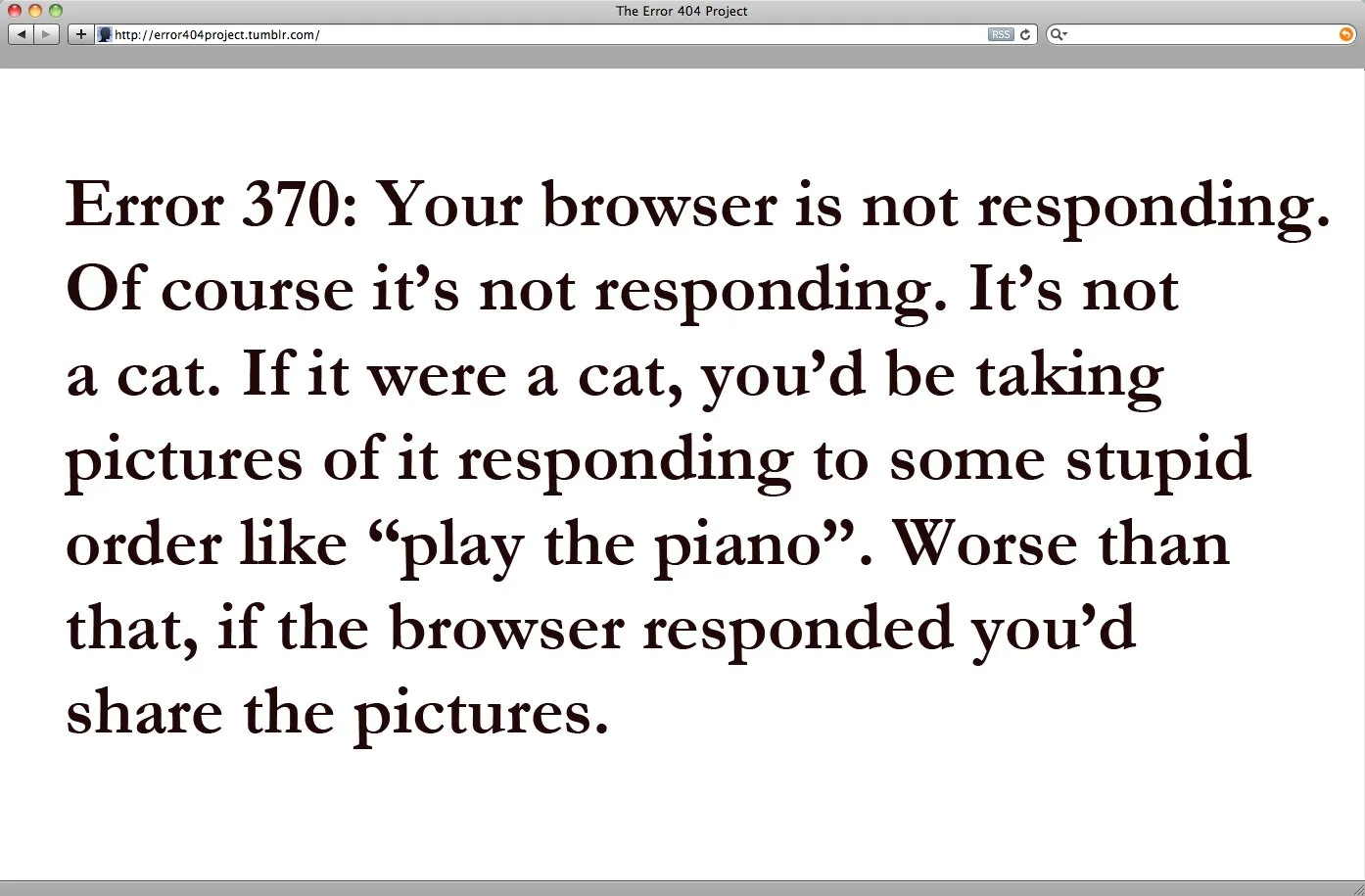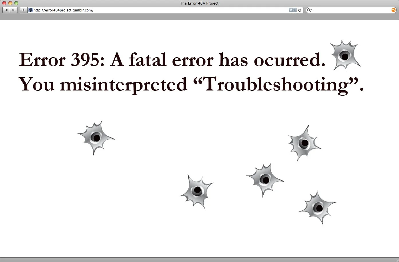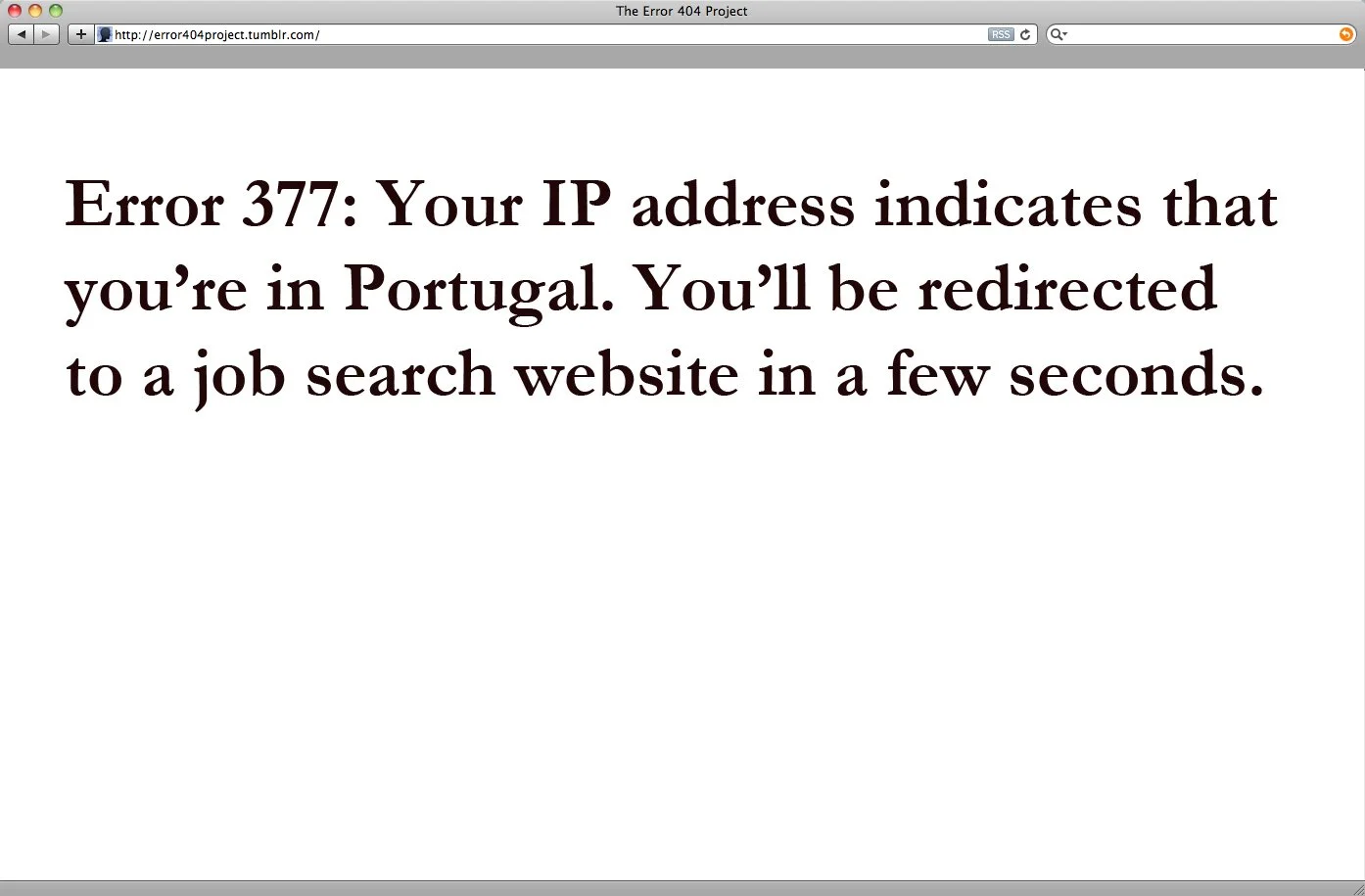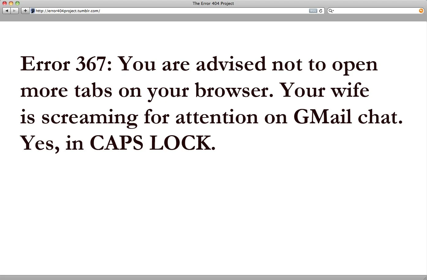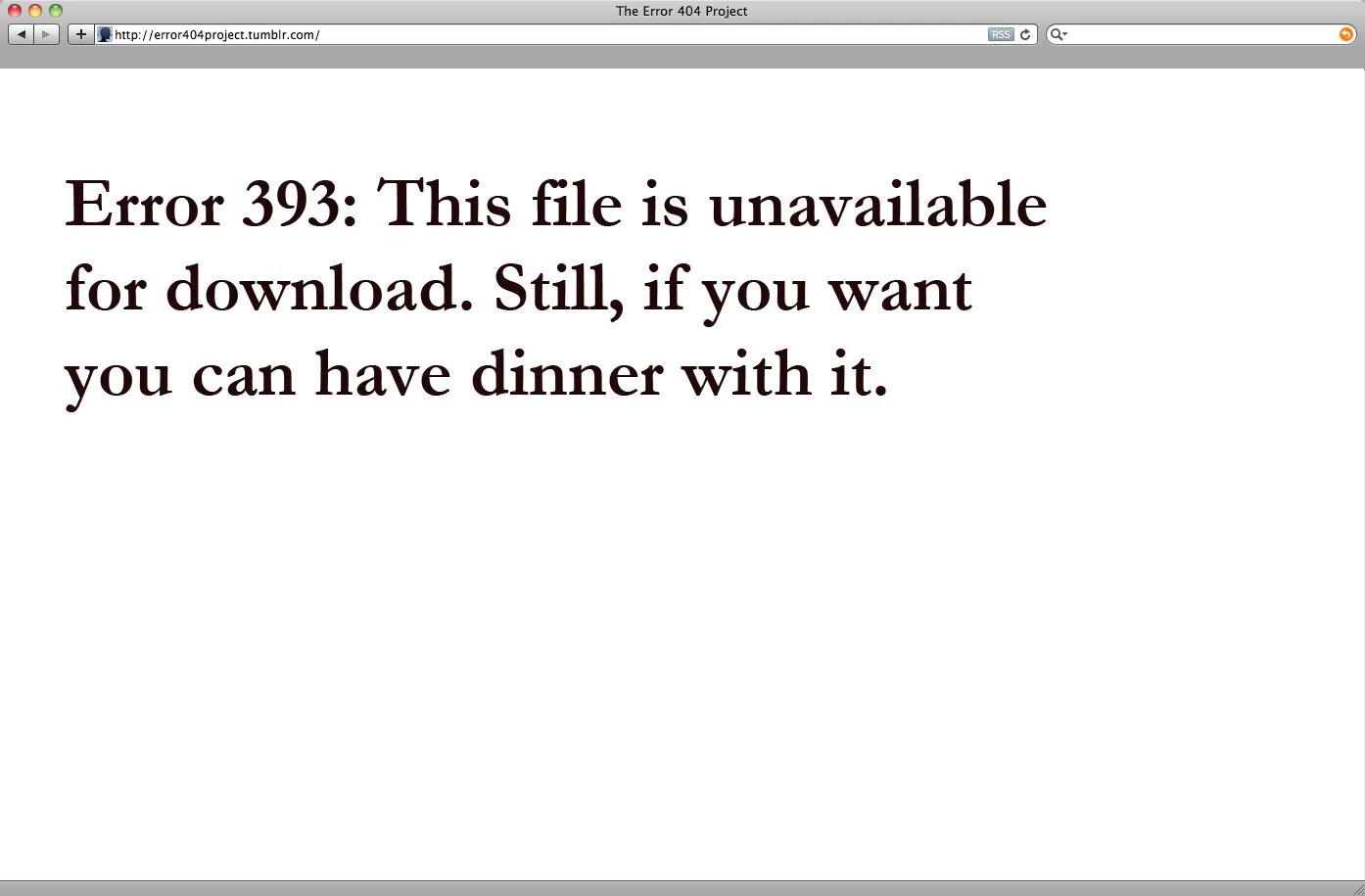 [PT] Tempos houve em que o "Erro 404", de "Página Não Encontrada", era um dos resultados mais populares da Internet. Todos os dias nos cruzávamos com ele, mas nunca reflectimos o suficiente sobre o assunto. Foi por essa razão que criei o "Error 404 Project", um site entretanto eliminado por falta de paciência do servidor: para responder à pergunta "Quais são os outros 403 erros?". Não tendo encontrado respostas que me satisfizessem o desejo de galhofa, inventei-os. Até ao Erro 360, que entretanto meteu-se o almoço, o Natal e a festa da escola dos miúdos.