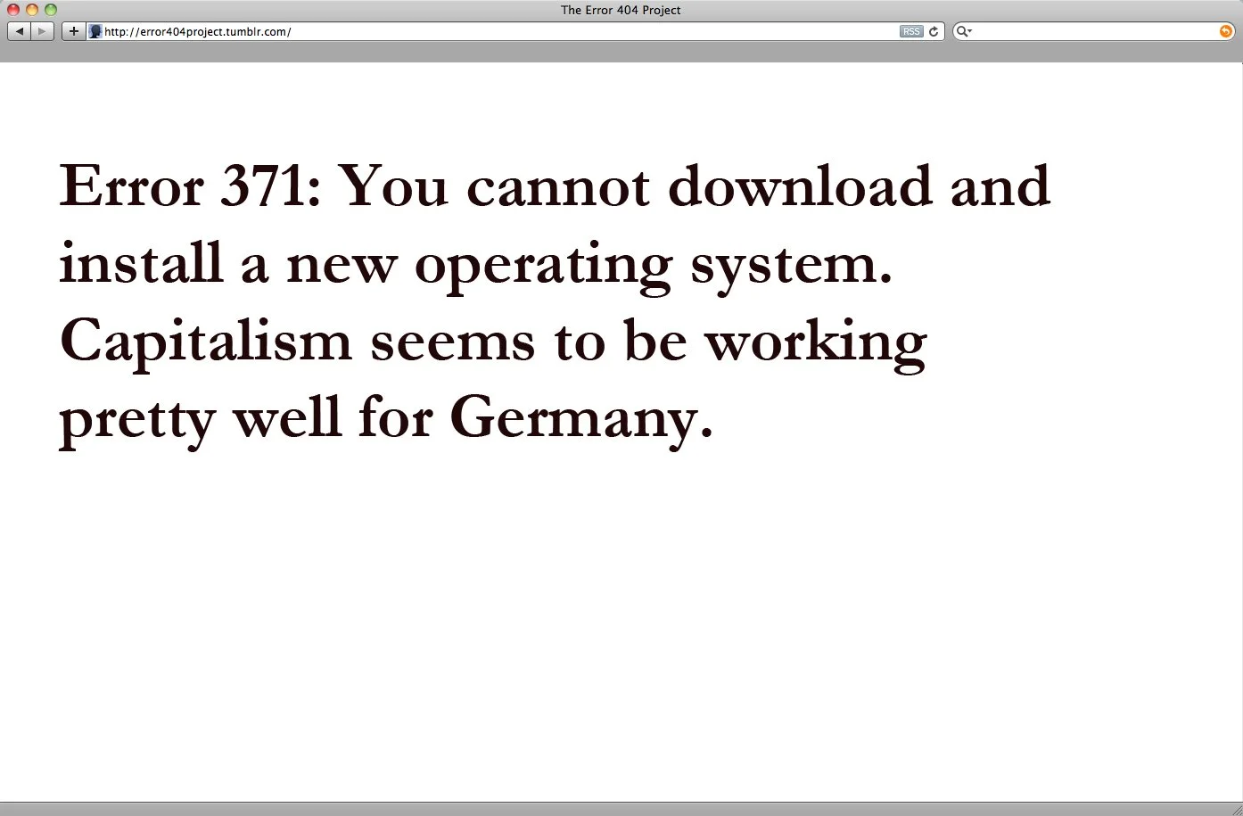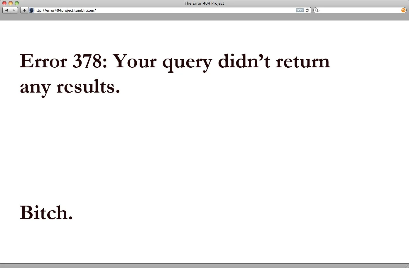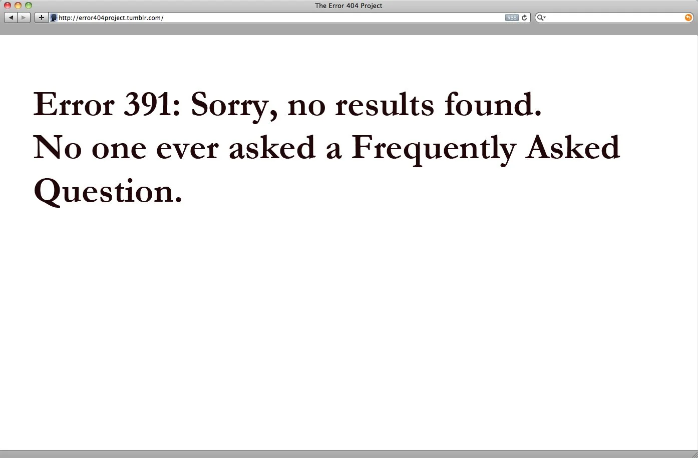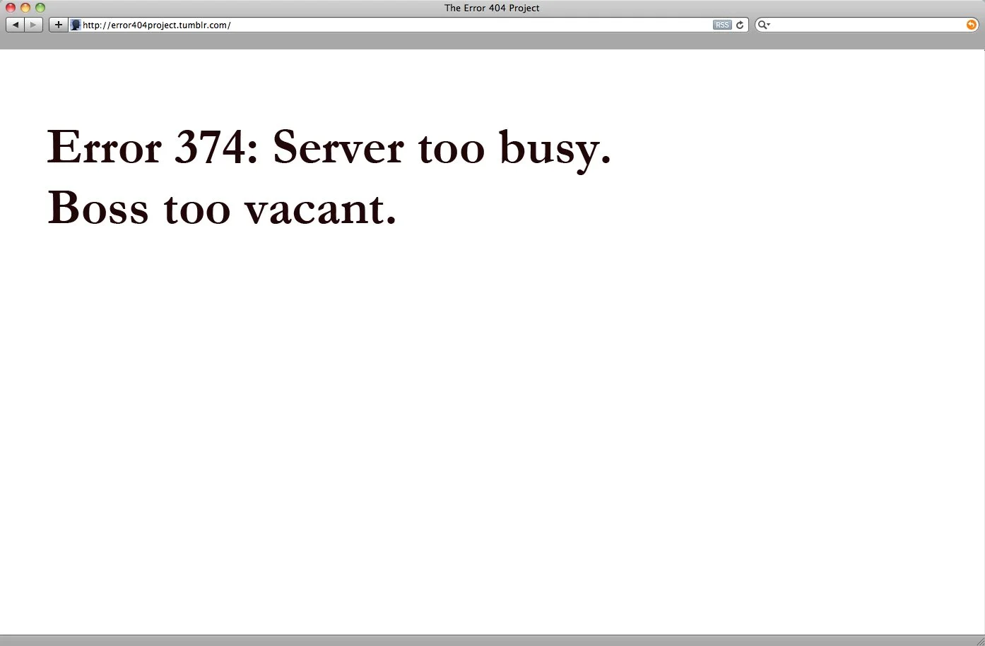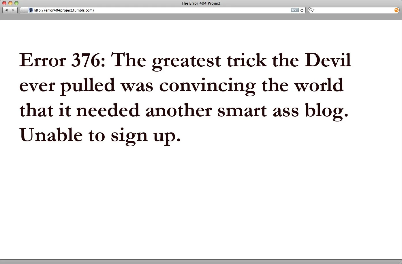[PT] Tempos houve em que o "Erro 404", de "Página Não Encontrada", era um dos resultados mais populares da Internet. Todos os dias nos cruzávamos com ele, mas nunca reflectimos o suficiente sobre o assunto. Foi por essa razão que criei o "Error 404 Project", um site entretanto eliminado por falta de paciência do servidor: para responder à pergunta "Quais são os outros 403 erros?". Não tendo encontrado respostas que me satisfizessem o desejo de galhofa, inventei-os. Até ao Erro 360, que entretanto meteu-se o almoço, o Natal e a festa da escola dos miúdos.