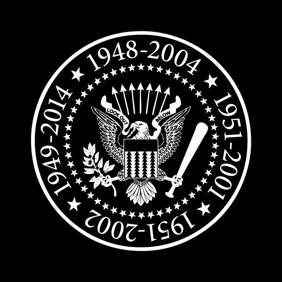 Ostentando os nomes artísticos dos quatro fundadores, esta versão pervertida do escudo do Presidente dos Estados Unidos eterniza uma banda de que, na verdade, desde 2014 não resta ninguém. Com a morte de do último fundador, Tommy, em 2014, ocorreu-me uma nova versão do logo para uma pequena homenagem nas redes sociais. É esta aqui à direita.